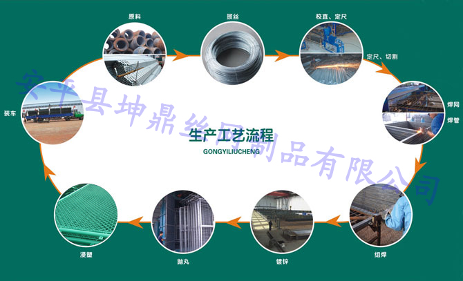 按公司規(guī)定篩選材料供應(yīng)商并采購(盤條、鐵絲、管材)——進(jìn)廠檢驗(yàn)---調(diào)試機(jī)器和網(wǎng)片生產(chǎn)---首片檢驗(yàn)與大貨的過程檢驗(yàn)---胎具制作、框架下料與焊接---首件檢驗(yàn)與過程檢驗(yàn)----網(wǎng)片與框架的連(焊)接---首片檢驗(yàn)與過程檢驗(yàn)---立柱下料、折彎成型、邊耳焊接---首件檢驗(yàn)與過程檢驗(yàn)---配套安裝檢驗(yàn)---電鍍鋅或熱鍍鋅處理及檢驗(yàn)---浸塑處理及檢驗(yàn)---成品抽檢或全檢檢驗(yàn)---入庫倉儲----運(yùn)輸